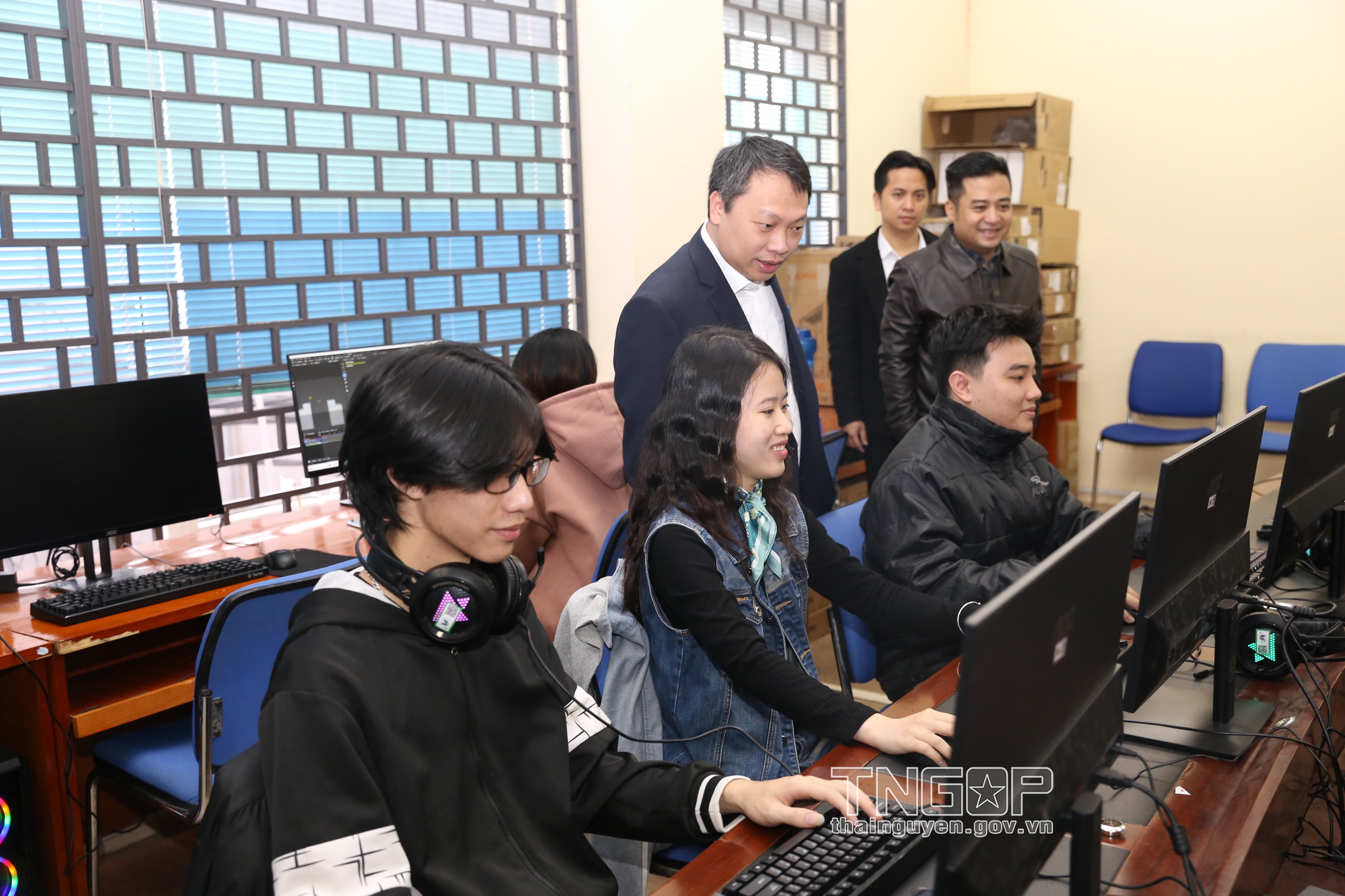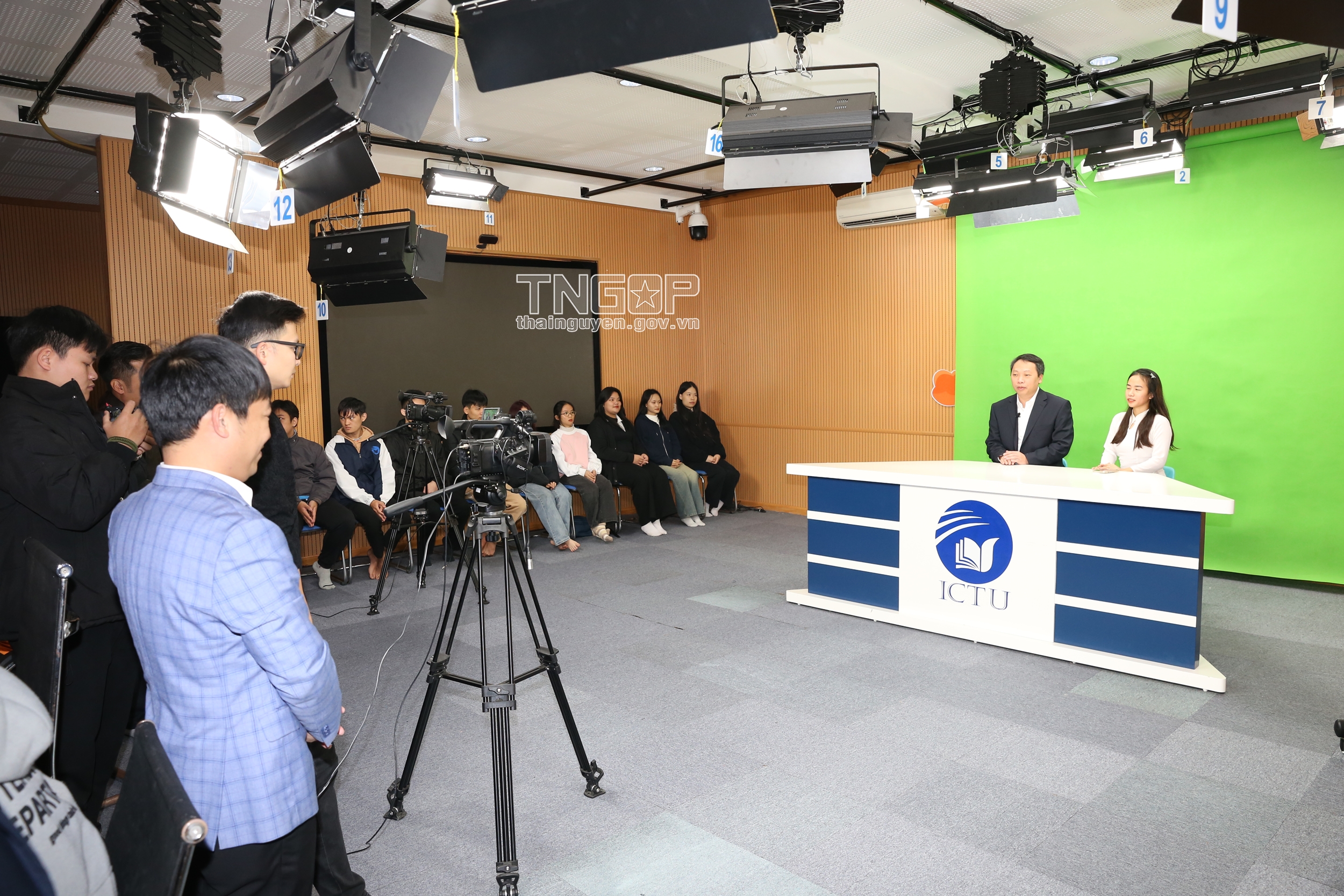 Đồng chí Chủ tịch UBND tỉnh Nguyễn Huy Dũng thăm phòng Studio, phim trường phục vụ quay phim, sản xuất các chương trình của Khoa Nghệ thuật và Truyền thông, Trường Đại học Công nghệ thông tin và Truyền thông